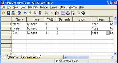 *La editarea unei variabile trebuie sa se tina cont de urmatoarele restrictii: numele variabilei sa fie unic, primul caracter sa fie o litera, sa nu contina simboluri speciale folosite in SPSS sau spatii.