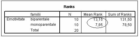 Se poate ignora primul dintre cele doua tabele de output. Acest tabel indica faptul ca rangul mediu dat parametrului "Emotivitate" pentru primul grup (adica valoarea 2) este 13,15, iar rangul mediu pentru al doilea grup (adica valoarea 1) este de 7,85. Aceasta inseamna ca valorile din grupul 2 (biparentale) au tendinta sa fie mai mari decat cele din grupul 1 (monoparentale).