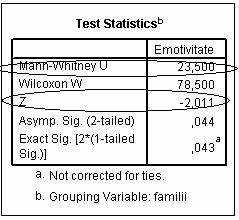 Rezultatele obtinute in urma acestei analize se pot raporta astfel: " Testul U Mann-Whitney a concluzionat ca scorurile emotivitatii la copii din fa,iliile cu doi parinti sunt semnificativ mai mari decat la cei din familiile cu un singur parinte (U=23,5, N1,2=10, p two-tailed p= 0,044)".