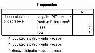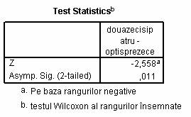 Rezultatele obtinute pot fi raportate astfel: Exista o diferenta semnificativa intre numarul de cuvinte verbalizate de copii intre 18 si 24 de luni (Wilcoxon: N=8, z =2,56, two-tailed p = 0,011).