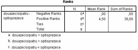 Se poate ignora primul dintre cele doua tabele de output. Acestea indica numarul de diferente negative (0), pozitive (8) si inexistente (0) in ceea ce priveste datele ordonate dupa cele doua varste, si media si suma catalogate negative si pozitive. Valorile pentru doua zeci si patru de luni sunt mai mari decat cele pentru optsprezece luni.