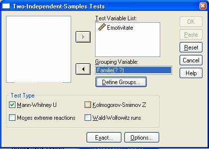 Se poate ignora primul dintre cele doua tabele de output. Acest tabel indica faptul ca rangul mediu dat parametrului Emotivitate pentru primul grup (adica valoarea 2) este 13,15, iar rangul mediu pentru al doilea grup (adica valoarea 1) este de 7,85. Aceasta inseamna ca valorile din grupul 2 (biparentale) au tendinta sa fie mai mari decat cele din grupul 1 (monoparentale).