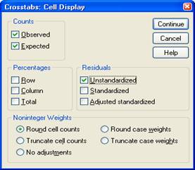 In sectiunea Counts se selecteaza Expected. Se selecteaza Unstandardized in sectiunea Residuals. Se selecteaze Continue, apoi se apasa OK in ecranul anterior care reapare. * Termenul rezidual se refera la diferente.