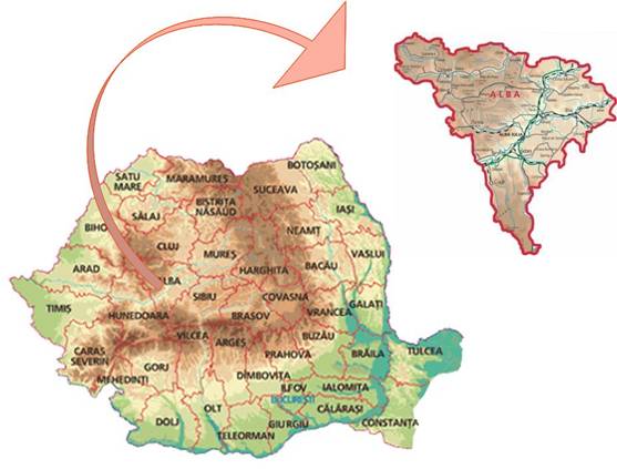 Judetul Alba este situat in partea central-vestica a Romaniei, pe cursul mijlociu al raului Mures, in geospatiul de confluenta a acestuia cu Tarnavele, Ampoiul si Sebesul, cuprinzand partea sud-estica a muntilor Apuseni. Geometria unitatii teritoriale a judetului Alba este triunghiulara, cu varfurile orientate spre est, vest si sud si cu laturile spre nord-nord-vest, vest-sud-vest si est-sud-est. Acest judet se suprapune peste anumite parti din trei mari unitati de relief din tara noastra si anume: Carpatii Occidentali (Muntii Apuseni), Carpatii Meridionali (Muntii Sebesului) si Podisul Transilvaniei, precum si peste zona depresionara de contact dintre acestea, grefata pe Valea Muresului (depresiunea Alba Iulia-Turda) si prelungita spre est de Valea Secasului si spre vest catre culoarul depresionar al Orastiei.