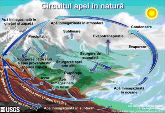 Rezervele de apa sunt distribuite in 5 parti ale ciclului hidrologic (fig.1). Cea mai mare parte a apei se gaseste in oceane, o alta fractie se gaseste sub forma de vapori in atmosfera (nori). O parte se afla in stare solida (gheata, zapada). Iar, cele mai importante surse pentru consumul uman le reprezinta apele de suprafata: rauri, lacuri si acumulari si apele subterane.