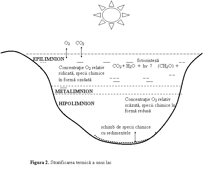In timpul verii stratul superficial epilimnion este incalzit de radiatia solara si, datorita densitatii scazute, "pluteste" deasupra stratului inferior (de la fundul lacului) - hipolimnion. Acest fenomen poarta denumirea de stratificare termica (Fig. 2). Cand exista un gradient termic semnificativ intre cele doua straturi, acestea nu se amesteca, fiind independente si avand proprietati chimice si biologice foarte diferite.