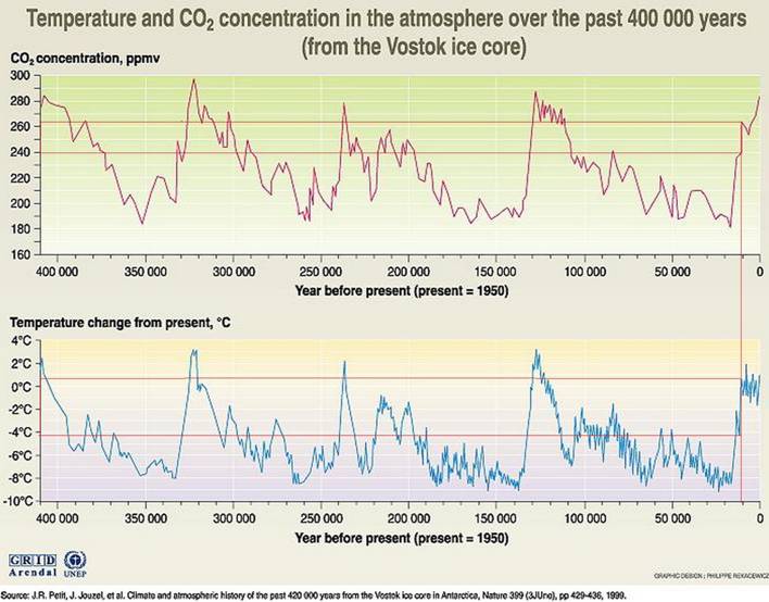 Analizind graficul : A . TEMPERATURE AND CO2 CONCENTRATION IN ATMISPHER OVER THE PAST 400.000 YEARS (FROM THE VOSTOK ICE CORE)