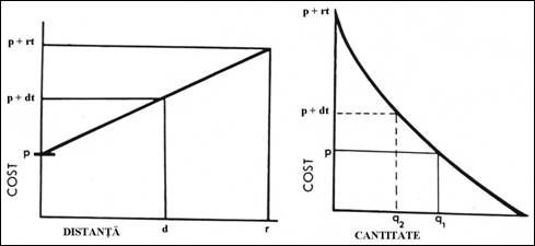 Fig. 15. Variatia costului in functie de distanta si a cantitatii cumparate in functie de cost in modelul Christaller. Sursa: B.J.L. Berry (1968)