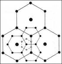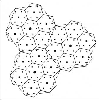 Fig. 20. Modelul Christaller. Aranjamentul spatial al locurilor centrale intr-o retea bazata pe principiul administrativ (K = 7). Sursa: J.U. Marshall (1989)