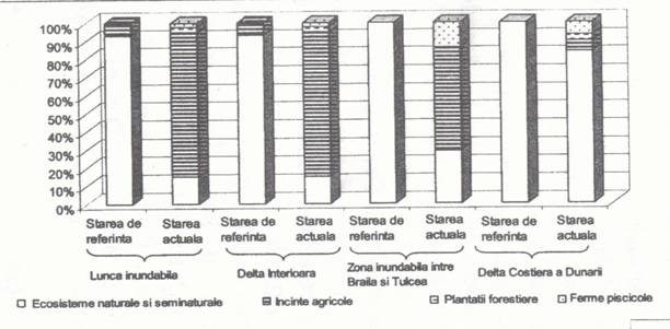 Pana la inceputul anilor 1950 (considerata perioada de referinta pentru aceste ecosisteme), mai mult de 90% din suprafata totala de peste 10.000 km2 ocupata de sistemul de zone umede al Dunarii inferioare constituia un model de ecosisteme naturale si seminaturale. Acesta avea in componenta sa aproximativ 45% ecosisteme acvatice permanente (lacuri, balti, japse, mlastini, canale, brate ale Dunarii), < 35% zone inundabile mai mult de 3-4 luni/ an, 15-20% grinduri fluviale si maritime, dune de nisip, precum si terenuri saraturate inundabile 1 sau maxim 2 luni/an.