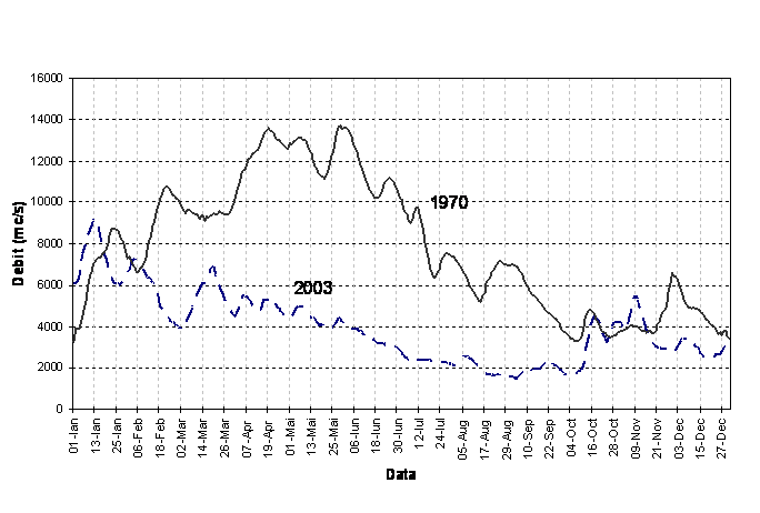 Fig. 2.2.2. prezinta hidrografele a doi ani caracteristici pentru regimul hidrologic al Dunarii, unul ploios 1970 cand s-a inregistrat un debit maxim de 13710 m3/s si celalalt secetos 2003 cand s-a produs cea mai severa seceta la nivelul bazinului hidrografic al Dunarii.