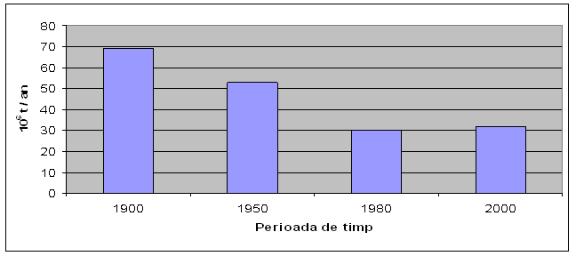 Fig. 2.2.3. Descresterea debitului anual de aluviuni in suspensie transportate de Dunare in sectiunea Isaccea in ultimul secol (DARDL)