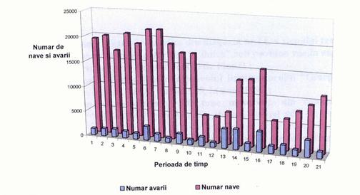 Cele mai importante poluari accidentale pe Dunare se produc datorita avariilor navale. Astfel numai in perioadele 1983 - 2004 s-au produs pe Dunarea fluviala intre km 655 - 1075, avarii care s-au soldat cu 30 de poluari accidentale, majoritatea cu produse petroliere (fig.2.4.1)