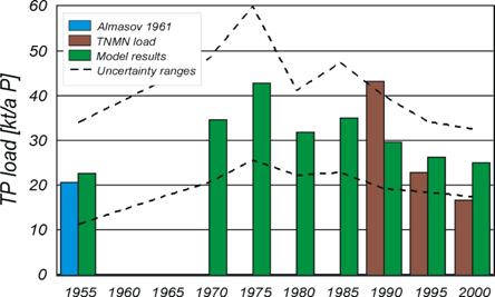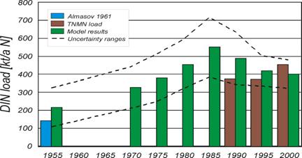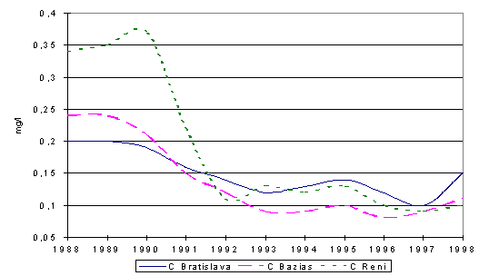 Variatia concentratiei de azot si fosfor pe Dunare in sectiunea Isaccea in perioada 1950 - 2000 (fig.2.5.5) prezinta o crestere in perioada 1980 - 1989 datorita dezvoltarii activitatilor economice din bazinul Dunarii, dupa care se constata o scadere a acestora datorita, in principal, reducerii activitatilor economice in tarile centrale si est-europene. Scaderea cea mai accentuata s-a remarcat in cazul incarcarii cu fosfor datorita retinerii in lacurile Portile de Fier I si II a circa 32% din cantitatile de fosfor afluente in lacul Portile de Fier I.