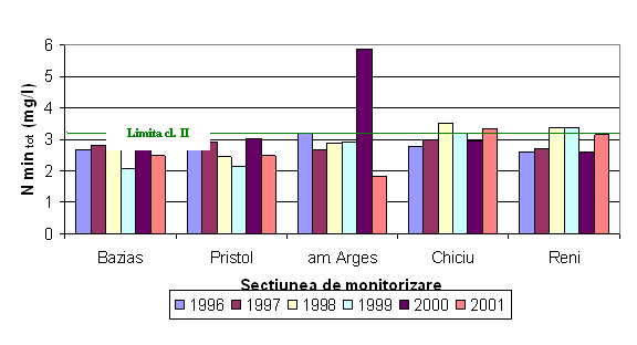 Ø 1,82 - 5,9 mg/l pentru N mineral total. Pentru acest indicator Dunarea s-a incadrat la toate sectiunile monitorizate la categoria a-II-a, cu exceptia unui singur an 2000 (Arges).