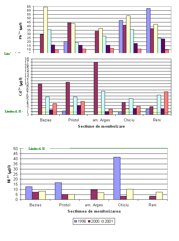 Fig. 2.5.6 Evolutia spatiala a concentratiilor de metale grele pe fluviul Dunarea in perioada 1996 - 2001 (ICDPR)