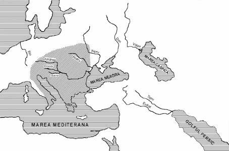 Fig. 1 - Vechea civilizatie Europeana ca parte a lumii stravechi in perioada maximei sale expansiuni, mileniul V i.e.n.
