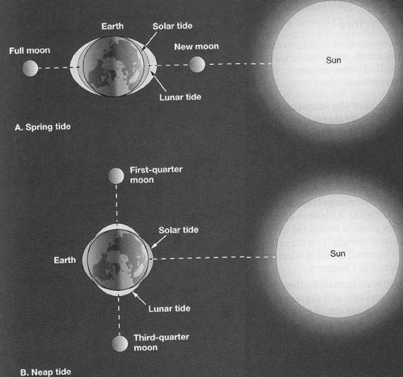 Figura 1-9 arata pozitiile Pamantului si soarelui in diferite momente ale ciclului de 29 de zile si jumatate. Cand soarele si luna sunt aliniate, luna aflandu-se intre soare si Pamant (luna noua, luna in conjunctie) sau cu luna pe partea Pamantului opusa soarelui (luna plina, luna in disjunctie) fortele ce produc mareele ale lunii si ale soarelui se combina (fig 1-9 sus). In acest timp se poate observa o inaltime mare a mareei datorita interferentelor constructive (cand doua valuri sau doua maree se suprapun) dintre fluxurile generate de luna si de soare. In acest timp apa la flux are inaltimi foarte mari, iar nivelul marii la reflux este foarte jos. Cand mareea atinge inaltimea maxima ea se numeste maree inalta. Cand Pamantul, soarele si luna sunt aliniate se spune ca luna este in sizigii (syzygia - uniune). Cand luna se afla in ultimul patrar fortele solare ce produc mareele formeaza un unghi de 90s cu fortele lunare ce produc mareele. Aceasta rezultand a fi o interferenta distructiva (interferenta distructiva se realizeaza cand doua valuri sau doua maree nu se suprapun, adica crestei valului ii corespunde baza celuilalt val si varful celuilalt ii corespunde bazei primului). In acest caz se observa o inaltime redusa a mareei, caracterizata de inaltimi mici ale nivelului apei marii la flux si inaltimi mai mari ale apei la reflux. Aceasta maree este numita maree moarta si luna se spune ca este in cvadratura.