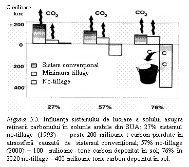 O cantitate prea mare de CO2 produsa in sol si eliminata in atmosfera, rezultata din procesele aerobe de mineralizare a materiei organice (afanari excesive) este considerata nu numai o cale de crestere a CO2 din atmosfera, dar si o pierdere a fertilitatii solului pe termen lung. Aceasta arata o accelerare a procesului de mineralizare a materiei organice din sol si a procesului pedogenetic de alterare a solului. SLCS modifica semnificativ cantitatea de CO2 eliminata in atmosfera. Astfel, Derpsch si Moriya, 1998 (figura 5), au calculat o cantitate de 400 milioane tone de carbon depozitate in solurile arabile din SUA, in anul 2020 (daca sistemul no-tillage se va aplica pe 76% din suprafata arabila), cu influenta asupra conservarii fertilitatii solului si asupra schimbarilor climatice.