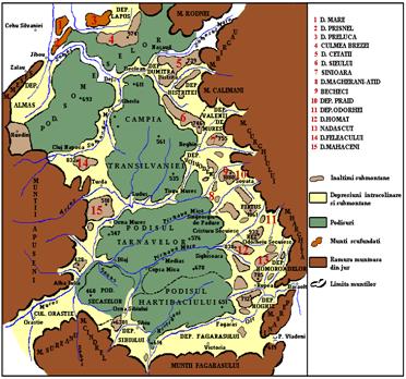 - la contactul cu Carpatii Orientali sunt dealuri si depresiuni de tip "subcarpatic", zona numita si "Subcarpatii Transilvaniei";
