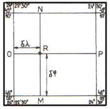Fig. 2. Determinarea coordonatelor geografice pe hartile topografice fara cadru geografic.