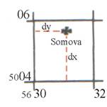 Ne propunem determinarea coordonatelor rectangulare ale punctului Somova (fig.3) de pe o harta topografica cu scara 1:100 000. Pe aceasta harta, caroiajul rectangular este trasat din 2 in 2 kilometrii, la scara hartii (2 cm).