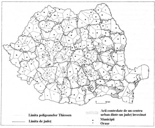 Cea mai simpla metoda de a determina, pe cale matematica (geometrica), zonele de influenta ale unei retele de locuri centrale intr-un spatiu dat, este cea a poligoanelor lui Thiessen. Astfel, indiferent de modul de dispunere in spatiu a locurilor centrale, ea statueaza ca fiecare client va apela la locul central cel mai apropiat ca distanta. Nu se tine cont de o posibila ierarhie a locurilor centrale, ci toate sunt considerate de acelasi rang. Astfel, rezulta zone de influenta de forma unor poligoane. Aceste limite ale zonelor de influenta se mai numesc si teoretice. Analizati zonele de influenta teoretice ale oraselor romanesti in anul 2000 (O. Groza, 2002). Ce constatati? . .
