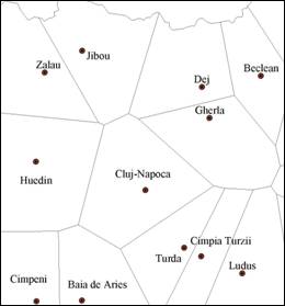 Aceste limite ale zonelor de influenta teoretice (poligoanele lui Thiessen) se pot trasa cu ajutorul calculatorului, dar si manual. Modalitatea grafica de a obtine zona de influenta a municipiului Cluj-Napoca este urmatoarea: