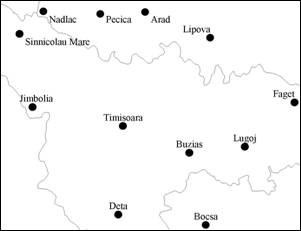 Fig. 25. Municipiul Timisoara si centrele urbane invecinate. Determinati zona de influenta teoretica a Timisoarei prin metoda poligoanelor lui Thiessen. Sursa: autorul