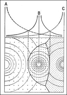 Fig. 27. Zonele de influenta a trei orase invecinate, de marimi distincte. Sursa: Jacqueline Beaujeu-Garnier, G. Chabot (1971)