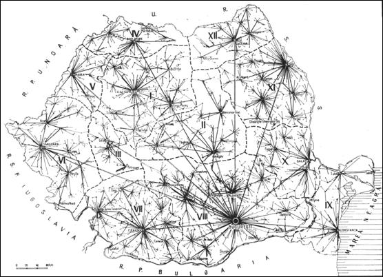 Fig. 28. Spatiul geografic functional al Romaniei. Principalele centre coordonatoare si regiuni polarizate de acestea. Sursa: I. Ianos (1987)