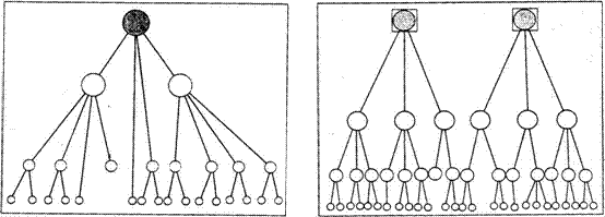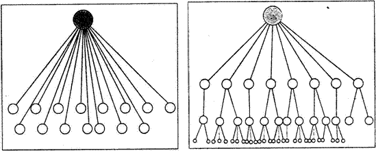 Fig. 29. Stanga: sisteme de asezari excesiv monocentrice. Dreapta: sisteme de asezari monocentrice. Sursa: I. Ianos, J.B. Humeau (2000)