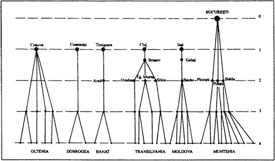 Fig. 32. Ierarhia asezarilor la nivelul superior, pe marile provincii istorice. Sursa: I. Ianos, J.B. Humeau (2000)