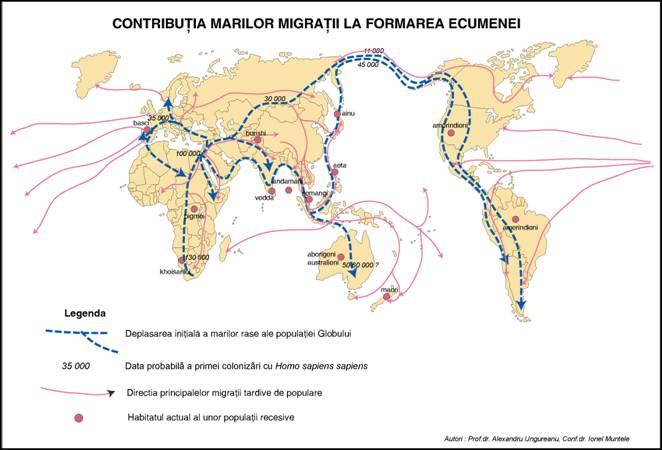 Indiciile arheologice atesta formarea timpurie a unor areale in care prezenta omului era mai frecventa : Orientul Apropiat, Europa Central-Sudica, estul Asiei. Se pare ca spre Asia au existat doua directii de migratii : una meridionala, care atinsese intre 40 000-60 000 i.e.n. Noua Guinee si Australia; alta mai nordica si mai activa, care a colonizat cea mai mare parte a uscatului eurasiatic si Americile. La sfirsitul paleoliticului, Orientul Apropiat pare a fi fost principala arie de concentrare a populatiei de pe Glob, intr-un context climatic si social extrem de favorabil care a premers revolutia neolitica. In aceasta perioada s-au format cu certitudine si caracteristicile rasiale majore, asa cum s-au transmis pana astazi, ca si diferentierile lingvistice.