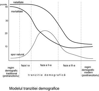 Aceasta evolutie diferentiata sta la baza teoriei tranzitiei demografice, larg acceptata pe plan mondial desi este criticata de unii specialisti. Tranzitia demografica in formularea sa teoretica este o descriere schematica a schimbarilor demografice care caracterizeaza istoria contemporana a omenirii. Ea porneste de la constatarea ca cei doi indicatori demografici principali (natalitatea si mortalitatea) sunt intr-o scadere continua odata cu modernizarea economica si culturala. Inainte de toate este caracterizata printr-un decalaj cronologic intre scaderea nivelului natalitatii si cel al mortalitatii, consecinta a progresului social-economic.