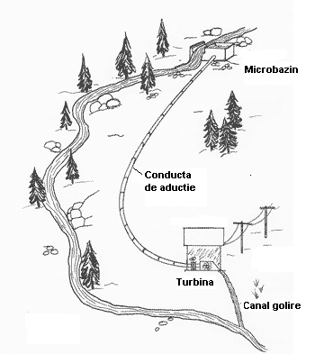 Apa este colectata intr-un micro-bazin si apoi canalizata prin conducta de aductie direct in turbina. Caderea pe verticala (cap), creaza presiunea necesara la capatul inferior al conductei de aductie, pentru a pune in miscare turbina. Cu cat va fi mai mare debitul sau capul, cu atat vom obrtine mai multa energie electrica.