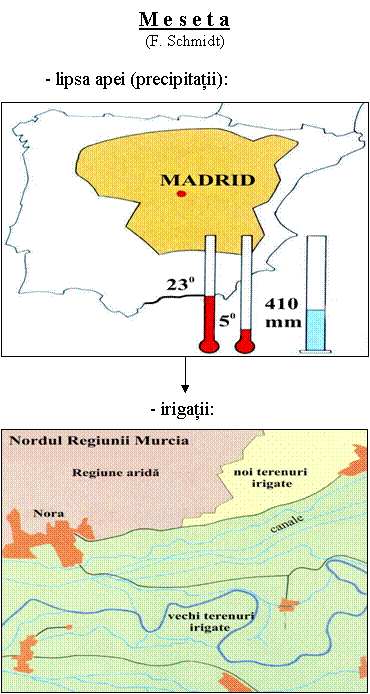 Meseta Spaniola. Meseta reprezinta un podis dezvoltat in limitele structurilor paleozoice, facand parte din cutarile armoricane (hercinice). Ea a functionat ca un soclu relativ rigid inregistrand miscari epirogenetice pozitive sau negative. Culmile (Sierrele) care strabat podisul de la nord-est catre sud-vest si pornesc din vestul sistemului muntos iberic si pana la Oceanul Atlantic sunt rezultatul miscarilor de cutare ale Alpilor care au cuprins si acest masiv producandu-i ample dislocari in partea mediana. Aceste sierre formeaza o culme centrala care poate fi considerata chiar cordiliera.