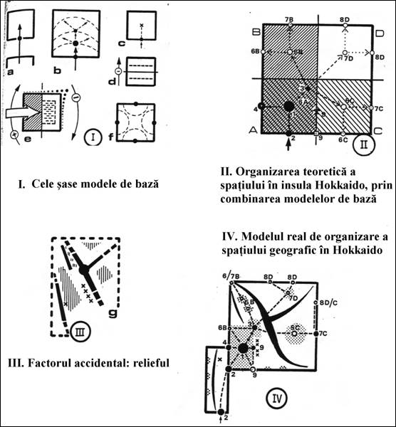 Fig. 5. Etape in elaborarea modelului de organizare a spatiului geografic al insulei Hokkaido. Sursa: R. Brunet (1980)