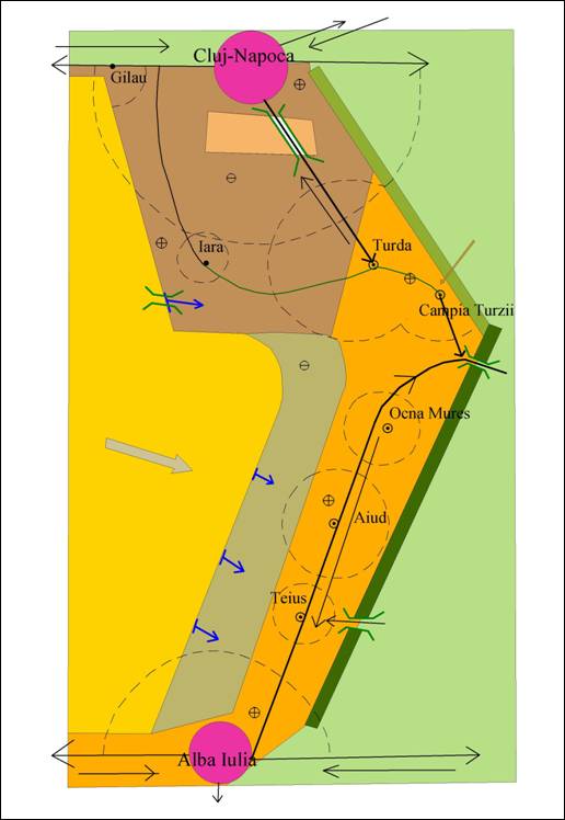 Fig. 8. Modelul de organizare a spatiului geografic in regiunea de contact a Depresiunii Transilvaniei cu Muntii Apuseni. Sursa: Alina Muresan (2003)