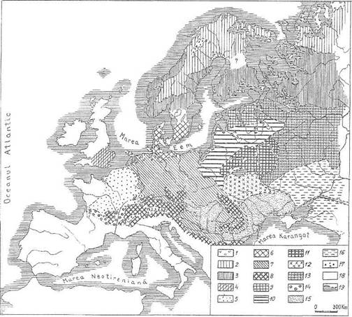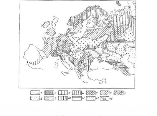 I. Vegetatia de tip boreal. A Formatiunile nord europene: 1 padure deschisa de mesteacan si pin (silvotundra); 2 padure de mesteacan, partial padure de molid; 3 padure de mesteacan si molid cu specii de copaci cu frunza lata (stejar, ulm, carpen). II Tipul vegetatiei de padure. A Formatiuni atlantice: 4 padure de carpen cu stejar si paduri de stejar si pin; 5 padure de stejar cu carpen si ulm; B Formatiuni central europene: 6 padure de carpen din zonele litorale; 7 padure de carpen din campii si inaltimi subalpine; in est cu molid, stejar si brad; 8 padure montana de carpen cu brad si molid; C formatiuni est europene: 9 padure de carpen din regiunile litorale nordice (cu molid si mesteacan); 10 padure de carpen din aria continentala de tranzitie (cu molid); 11 padure de carpen din partea centrala a campiei ruse (cu stejar si pin); 12 padure de carpen, foioase si pin; 13 padure mixta de stejar, carpen si copaci de margine; D Formatiuni mediteraneene: 14 padure mixta de stejar si padure de pin montan. III Tipul vegetatiei de stepa. 15 formatiuni central europene - pajisti de stepa cu carpen si padure de stejar (silvostepa); 16 formatiuni est europene - pajisti de stepa cu carpen si padure de stejar (silvostepa). IV Vegetatia alpina. 17 padure subalpina, inchisa, de conifere, pajisti alpine si tundra; 18 ariile fara vreo refacere a vegetatiei; 19 linia de tarm in interglaciarul Mikulino (stabilita si tentativa).
