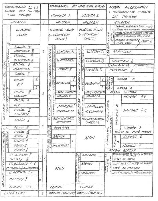 Tab. 2 - Corelatia dintre biostratigrafia de la Grande Pile, stratigrafia din nord-vestul Europei si schema paleoclimatica a Pleistocenului superior din Romania.