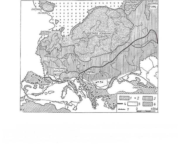 1 invelis de gheata si calota de gheata; 2 centre de glaciatiune montana; 3 zona prmafrostului; 4 limita copacilor arctici; 5 stepa loessica; 6 mozaic de silvostepa; 7 liniile de coasta.