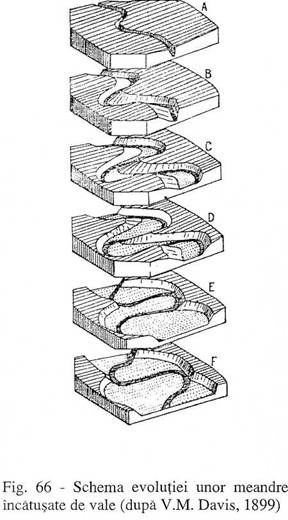 Meandrele sunt deplasari ale albiei minore, spre dreapta sau spre stanga, sub forma de bucle mai mult sau mai putin regulate. Uneori buclele ajung sa se uneasca (fig. 66), ceea ce duce la indreptarea cursului raului si aparitia unor meandre fosile, sub forma unor ochiuri de apa sau balti.