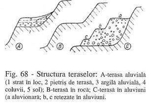 Podul terasei este format dintr-un pat de roci 'in loc', retezat aproape orizontal, suprapus de pietrisurile de terasa care, la randul lor suporta un orizont de argila fina aluviala (fig. 68). La tatana terasei apar adesea coluvii sau conuri de dejectie. Peste acest intreg depozit, adesea exista strate de loess cu benzi de soluri fosile in cadrul lor.