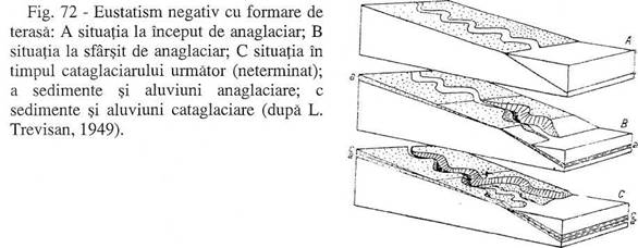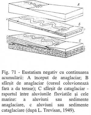 Prin urmare, in perioadele glaciare, cand nivelul oceanului planetar scadea, se producea eroziunea raurilor in cursurile inferioare si taierea teraselor. Aceasta presupune ca,