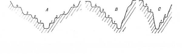 Fig. 75 - Dispunerea teraselor in profil transversal: simetrie (A), asimetrie totala (B) si partiala (C) (dupa Gr. Posea si colab, 1970)