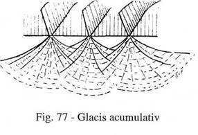 Formarea piemonturilor are loc in mai multe faze, la baza proceselor specifice stand permanent principiul atingerii profilului de echilibru al raurilor. Prima faza este aceea a aparitiei unor conuri de dejectie, care in faza a doua vor ajunge sa se ingemaneze si sa dea nastere la ceea ce se numeste glacis aluvial (fig. 77) Cand glacisul ajunge sa depaseasca circa 1 km, putem considera ca s-a intrat in faza de piemont, adica o campie usor inclinata, peste care se astern paturi aluviale si conuri de dejectie care se evazeaza si se estompeaza.