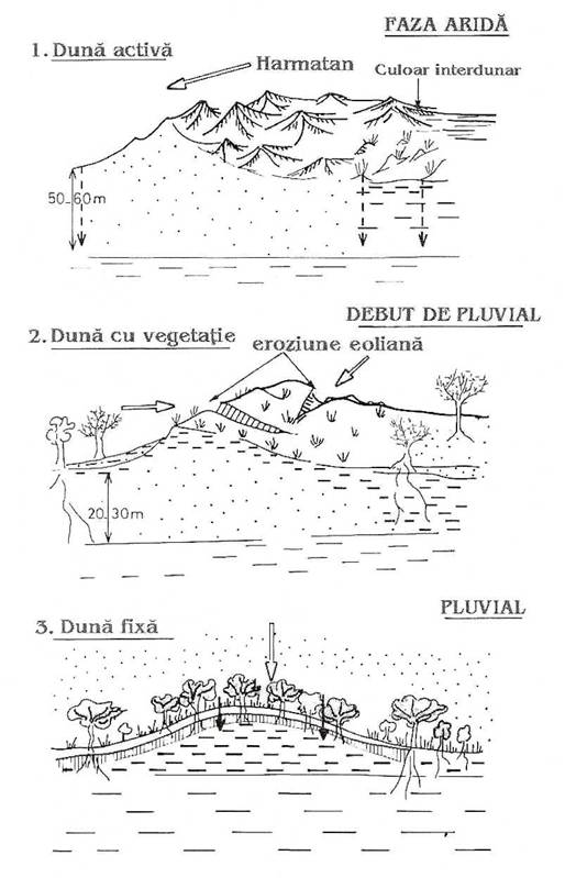 In timp ce la latitudinile inalte ale pamantului s-au instalat inlandisurile specifice glaciatiunii cuaternare, regiunile sudice, cum ar fi de exemplu in Africa, erau stapanite de perioade climatice umede, cunoscute sub numele de perioade pluviale, despartite de faze uscate. Pentru astfel de regiuni cele mai elaborate studii au cuprins Sahara, aceasta imensa unitate morfofunctionala, dominata de vanturi care transporta cantitati imense de nisipuri, pe care le depun sub forma de barcane (dune in crestere), de sisteme de creste-culoare, de dune alungite, erguri etc. (fig. 78, 79).