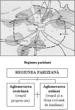 Regiunea pariziana. Este dominata de prezenta orasului Paris, o aglomerare urbana cu peste 9,3 mil. loc., situata in centrul Bazinului Parisului, pe fluviul Seine. Parisul cuprinde aglomeratia restransa sau orasul propriu-zis si aglomeratia extinsa care include si aglomeratia precedenta plus a doua coroana de banlieue. Urbanizarea are caracter discontinuu. Cinci centre mari Cergy-Pontoise, Marne-L-Valee, Saint-Quentin, Evry, Melun-Senart, preiau o serie de activitati ce apartineau insasi capitalei stabilizand populatia. La circa 100-200 km se intalneste o alta centura de orase: Orleans, Tours, Amiens, Rouen, Reims, cu care Parisul mentine legaturi functionale. Cea mai dinamica zona este Sena inferioara (Bass Seine) cu activitati industriale multiple (petrochimie, siderurgie, industria automobilelor si avioanelor, industria textila, chimica). Activitatile portuare, avand in vedere prezenta celor doua porturi, Le Havre si Rouen (380.000 loc.), au un loc deosebit in structura economiei.