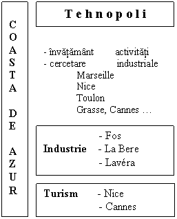 La est de Rhne, in regiunea Provence-Alpes-Cote d'Azur, orasele Marseille, Nice, Toulon si altele cum sunt Grasse, Cannes, Antibes alcatuiesc unii dintre tehnopolii tarii care asociaza numeroase intreprinderi industriale, institute tehnologice, de invatamant si cercetare. Prin urmare pe Coasta de Azur se poate vorbi in aceeasi masura de prezenta turismului si industriei.